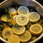 • dann die Blüten in einen großen Kochtopf geben, mit dem Wasser aufgießen und Zitronenscheiben ohne Kerne hinzugeben